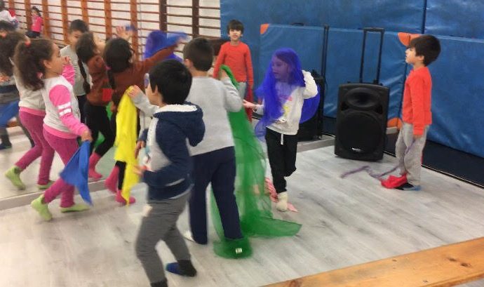 Així és un dia de psicomotricitat amb P5 amb 3 racons de jocs diferents.