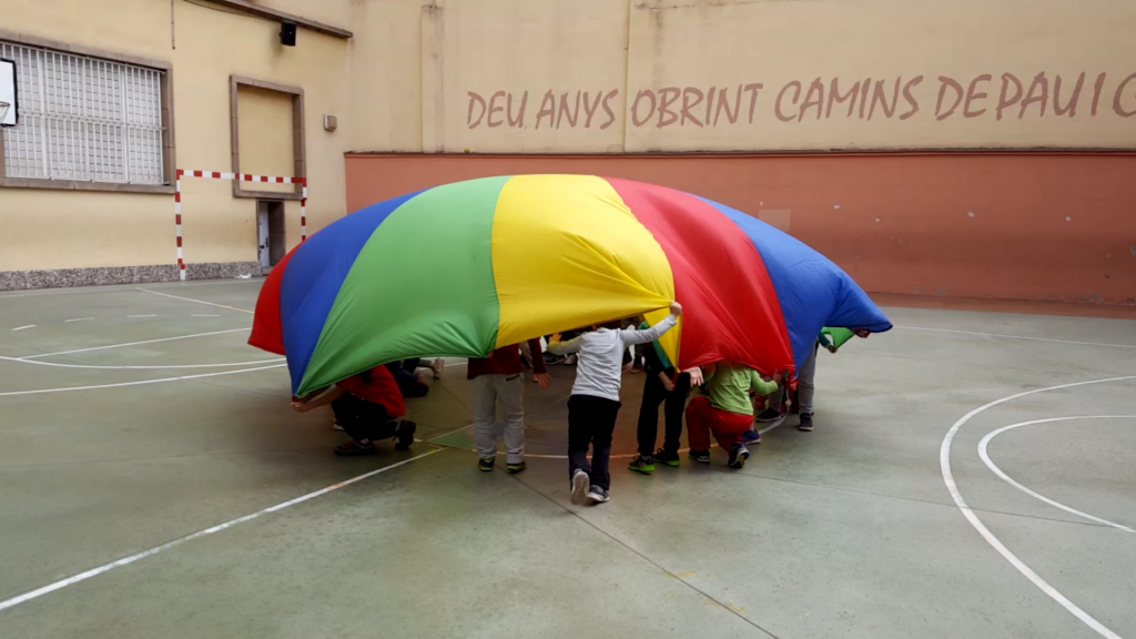 És un paracaigudes cooperatiu i pot servir per fer un munt de jocs, a nosaltres el que més ens ha agradat ha estat l’iglú.
