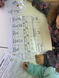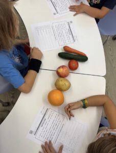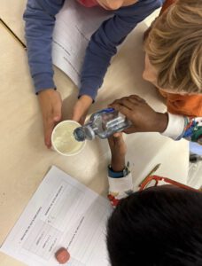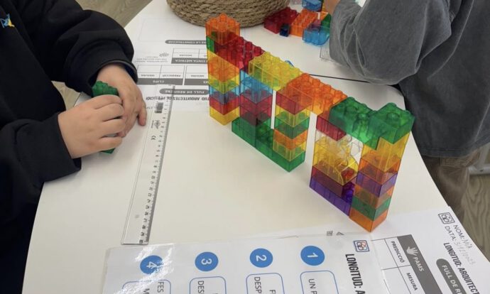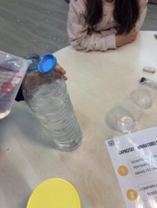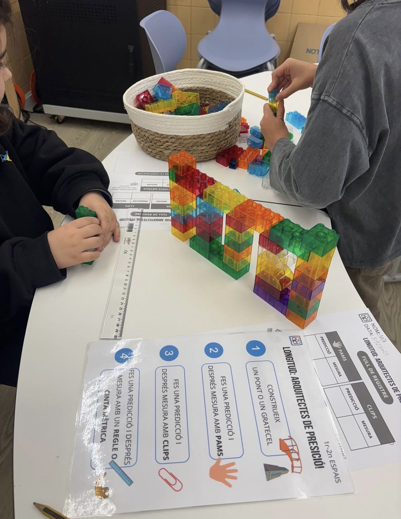 Als espais de 1r i 2n descobrim la mesura experimentant: comparem els nostres pams per mesurar longituds, fem prediccions de pes i les comprovem amb la balança, juguem amb el calendari per entendre el pas del temps i estimem quants gots omplirem abans de verificar-ho.