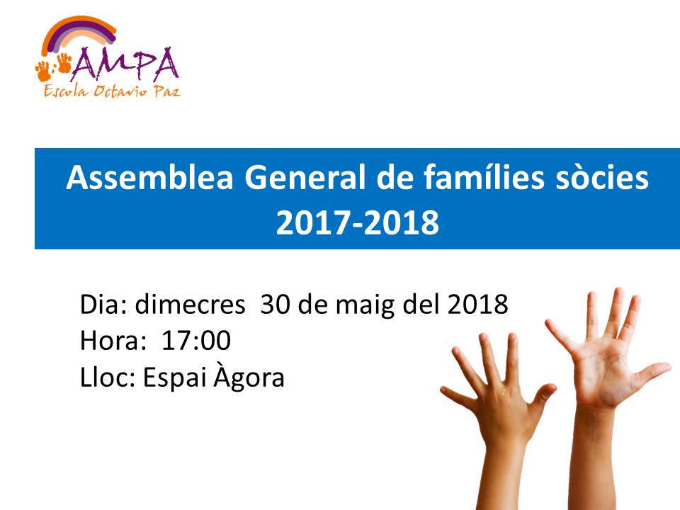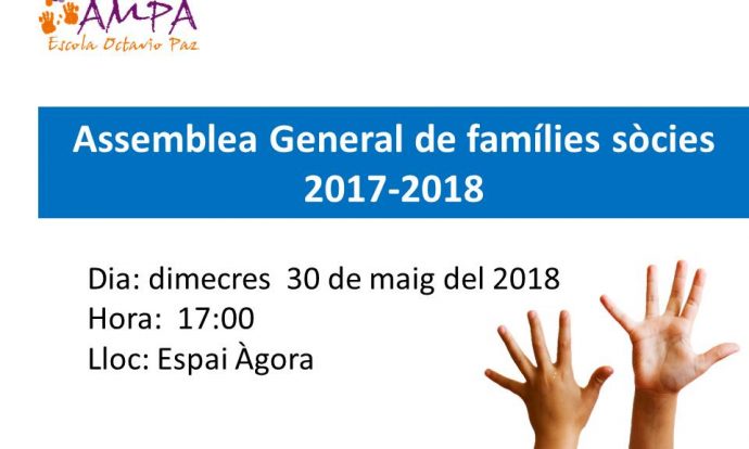 Benvolgudes famílies sòcies de l’AMPA. El dimecres 30 de maig a les 17:00 a l’espai Àgora de l’escola tindrà lloc l’Assemblea General de famílies associades el curs 2017/18.