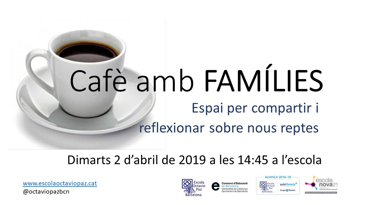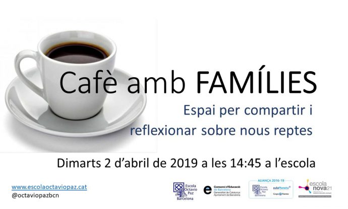 Benvolgudes famílies! Us convidem el proper dimarts 2 d’abril a les 14:45 al CAFÈ AMB FAMÍLIES. Serà una trobada per compartir i reflexionar sobre l’evolució del projecte de transformació pedagògica de l’escola.