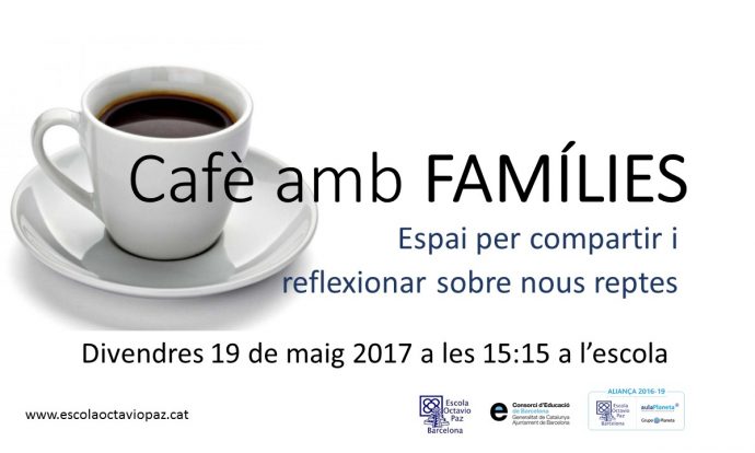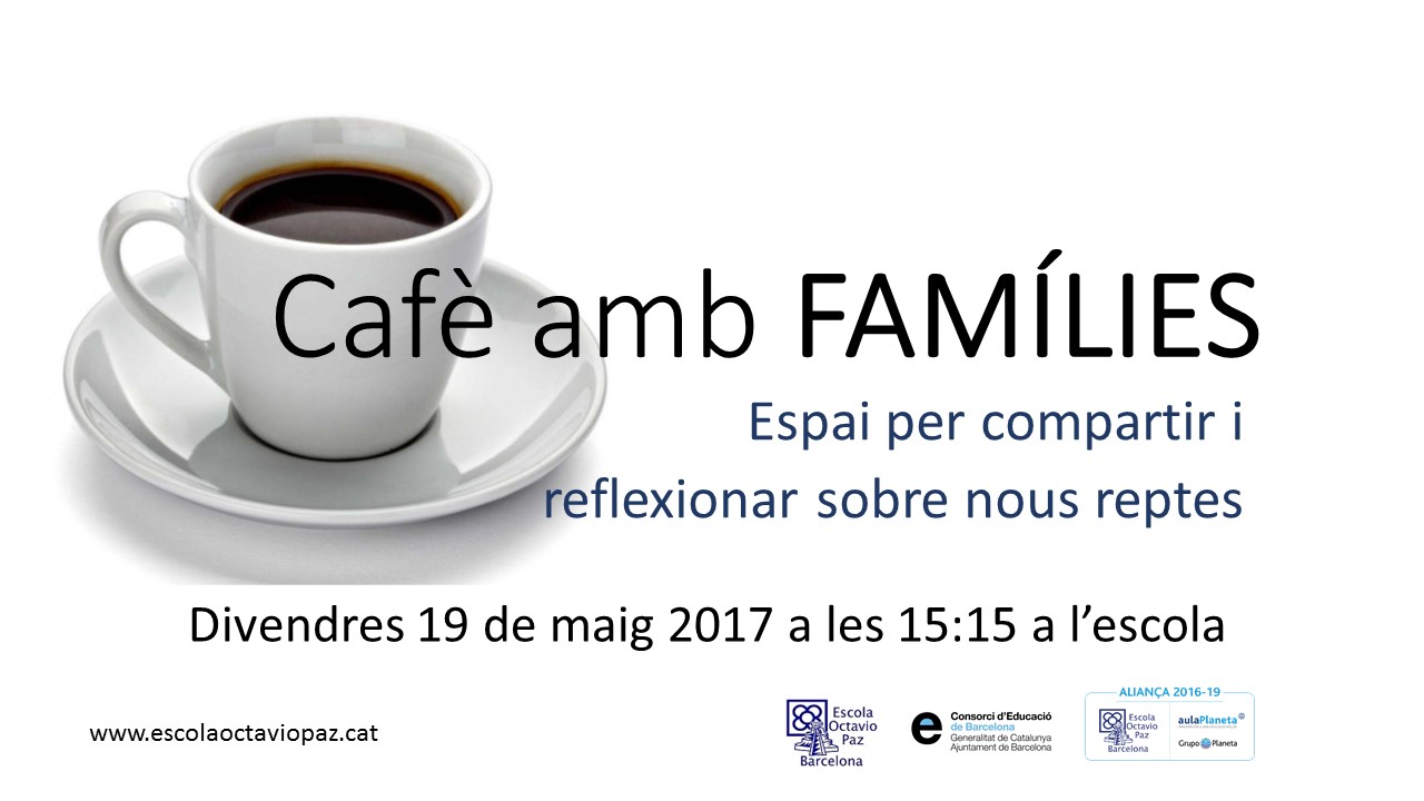 Us convoquem el proper divendres 19 de maig a les 15:15 a l’espai CAFÉ AMB FAMÍLIES on podrem compartir i reflexionar plegats sobre nous reptes! Ens agradarà molt comptar amb vosaltres