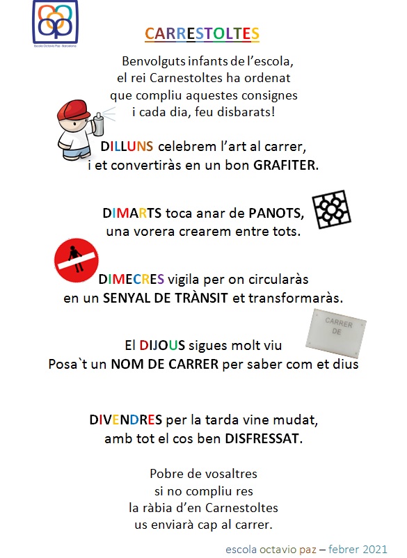 En Carnestoltes, rei dels pocasoltes ens ha deixat les següents consignes per la setmana del 8 al 12 de febrer.