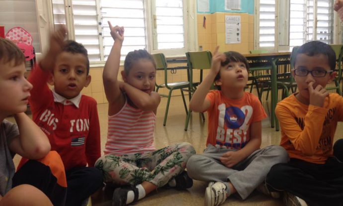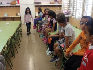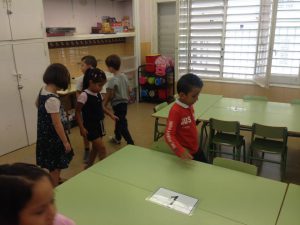 Quina distància hi ha entre la porta de l’armari i la pissarra? “15 passos”, “13 passos”, “14 rajoles i una mica més”, “més de 3 metres”… Com és que estan a la mateixa distància ens surten mesures diferents? Com podríem fer que ens sortís a tots la mateixa mesura? Tots aquests, i altres reptes se’ns comencen a plantejar la primera setmana d’espais a 1r i 2n