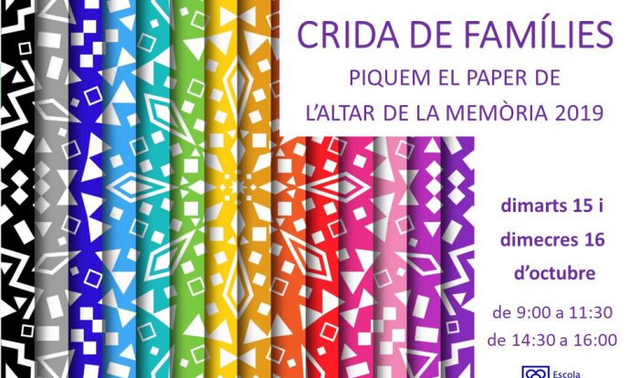 Dimarts 15 i dimecres 16 d’octubre De 9:00 a 11:30 i de 14:30 a 16:00 picarem el paper per l’Altar de la Memòria 2019. Podeu venir l’estona que us vagi més bé. Necessitem la vostra ajuda!