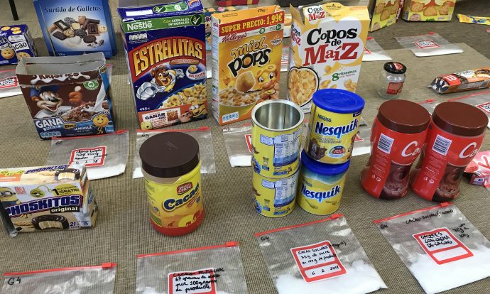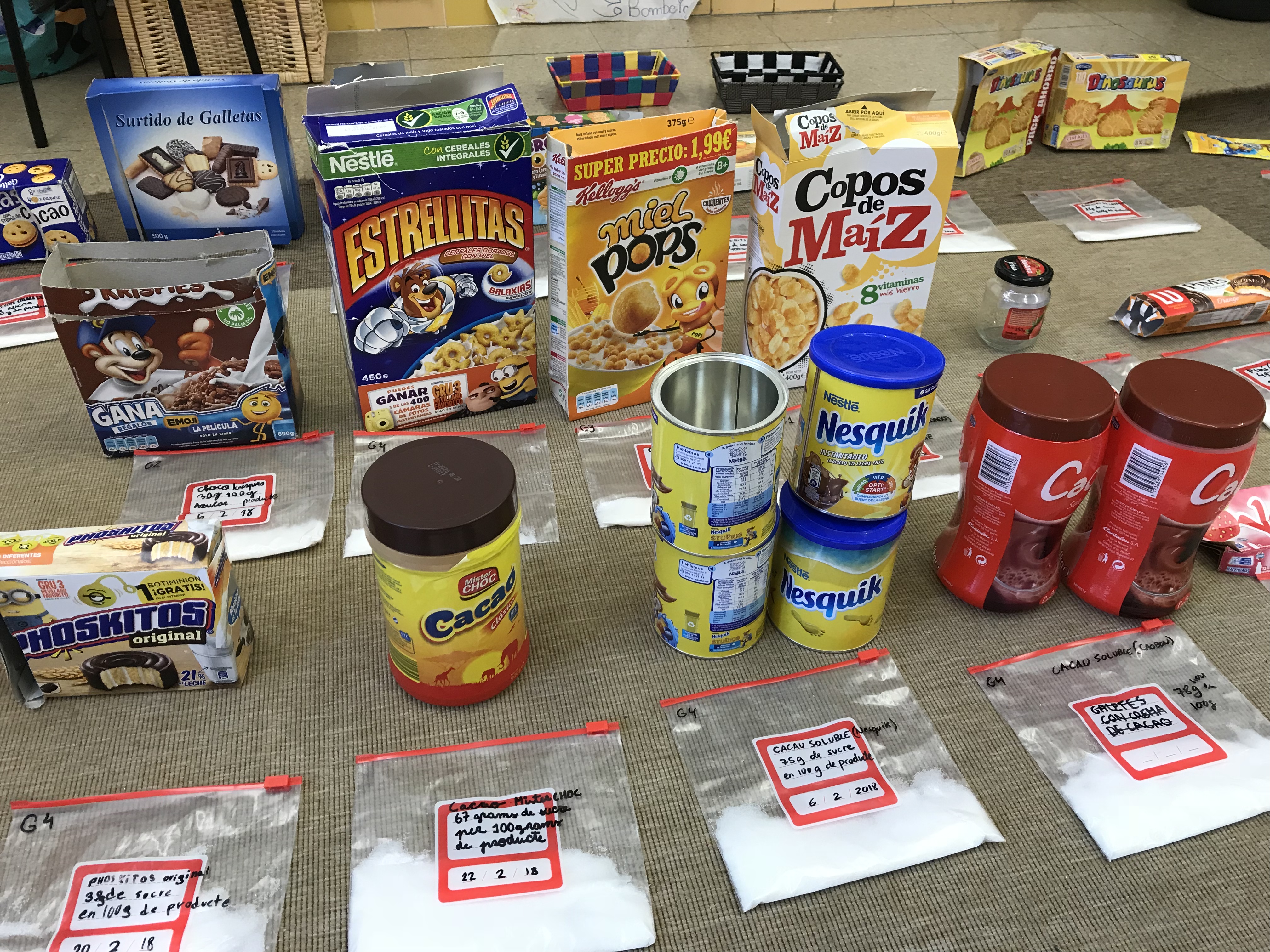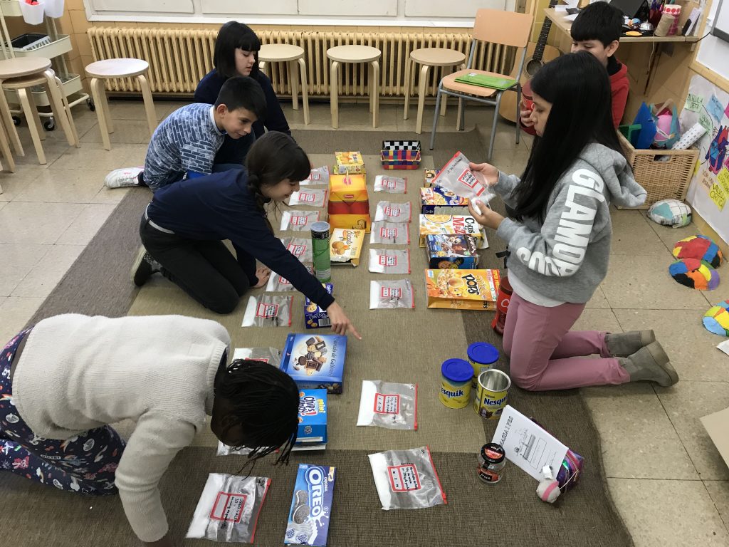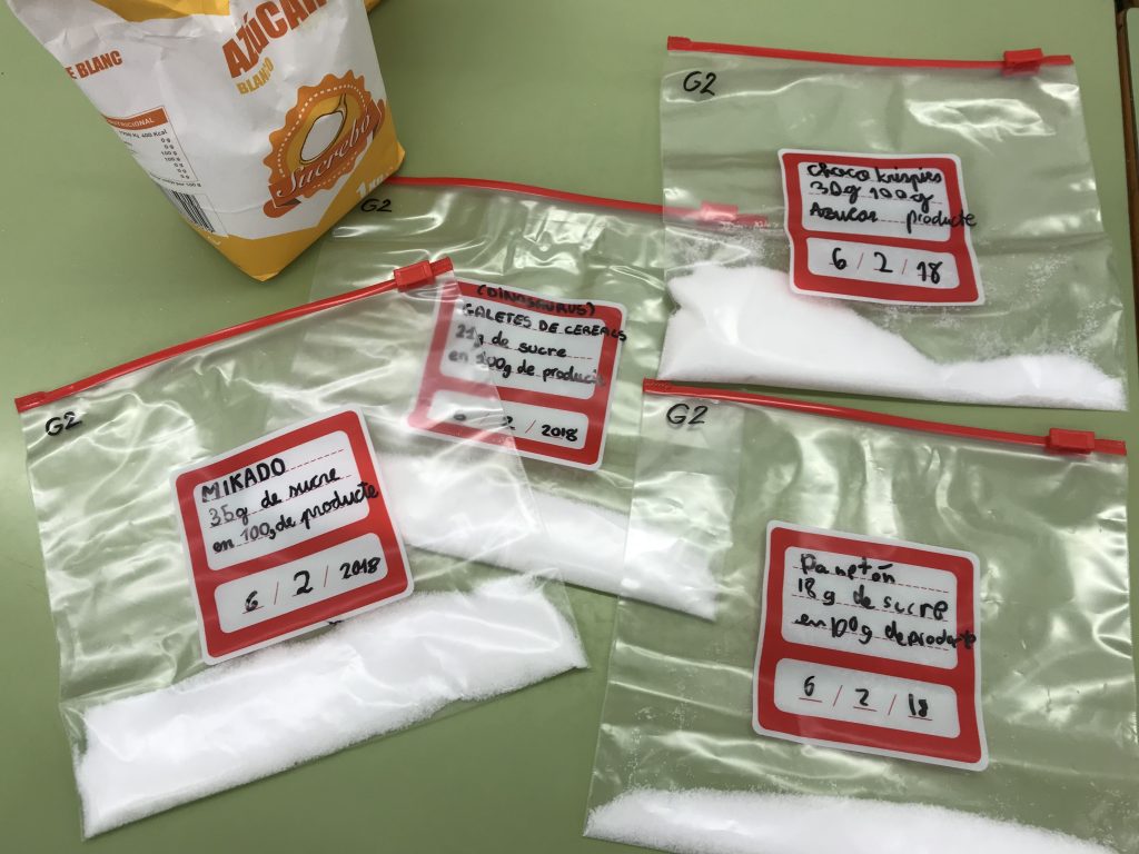 A l’espai de mesura estem investigant i comparant quins són els productes envasats, de tots els que hem anat portant, més adients a l’hora de confeccionar un menú setmanal. De moment, ens hem centrat en la quantitat de sucre que contenen. Sabíeu que l’Organització Mundial de las Salut recomana només la ingesta de 25 grams de sucre al dia?