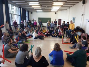 Entre tots van escollir el cartell que ens acompanyarà durant la gira 2017-18 i que el van crear “tot jugant”, amb les sensacions i les emocions, els infants de 5è i de 6è durant un assaig de la formació musical.