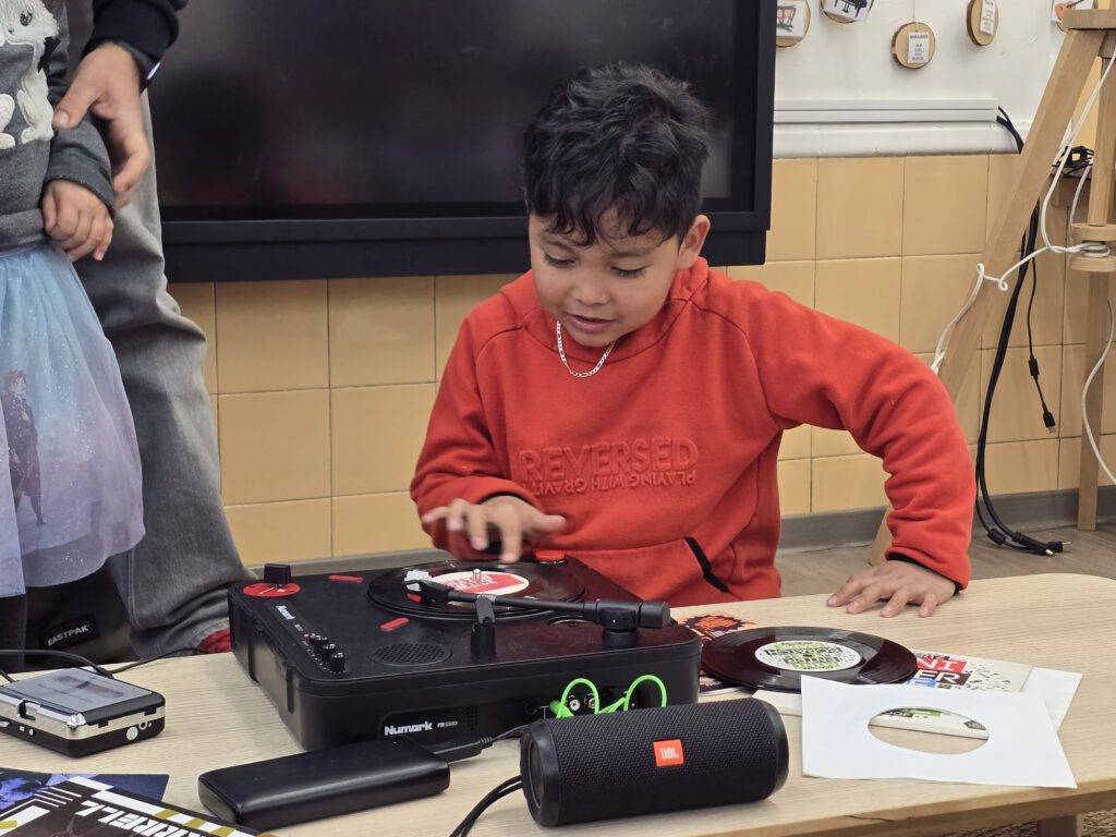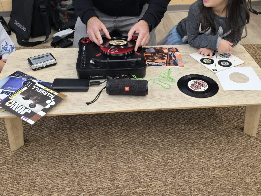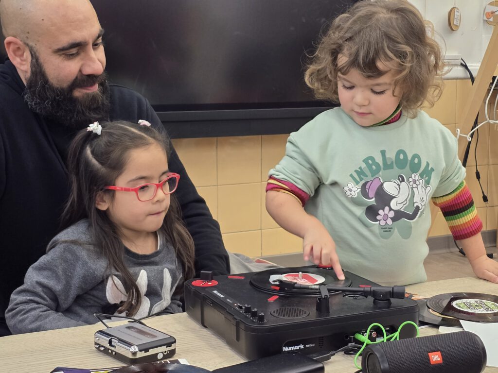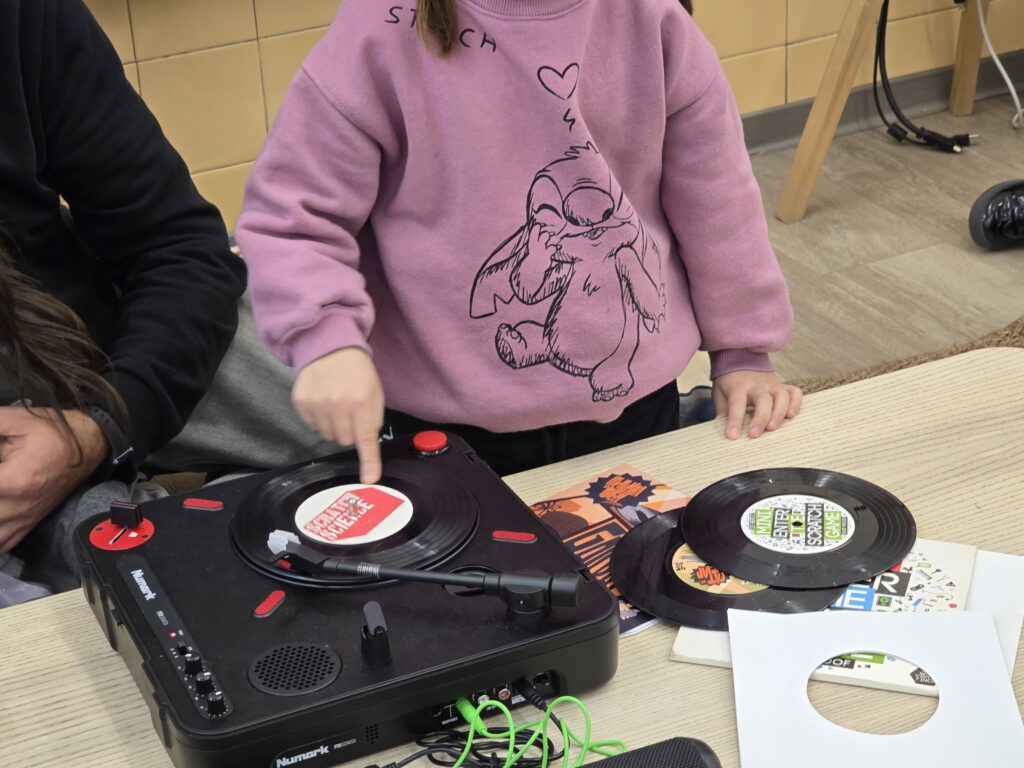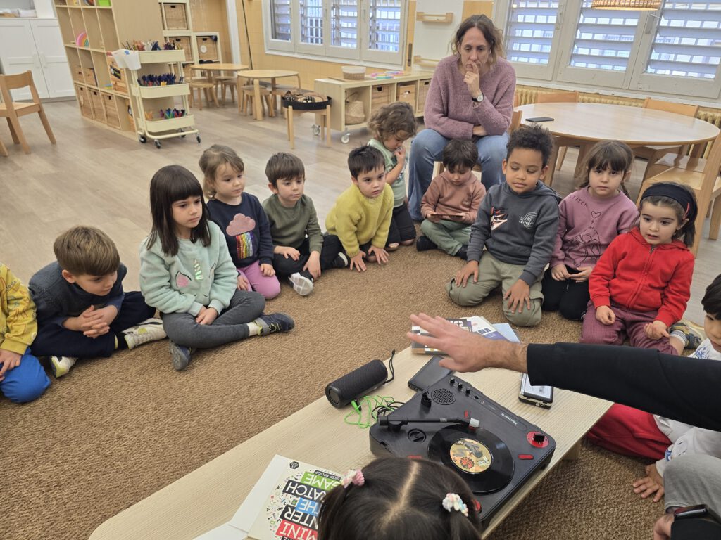 Al 1P, seguint amb el nostre projecte “el so”, avui hem tingut una sessió en la qual hem conegut un aparell que no coneixíem, el walkman, i les cintes que en ell s’hi poden reproduir, també hem vist en directe un plat (tocadisc), i els discs de vinil. Tot estris que ens permeten escoltar música. I el que més ens ha agradat, hem après a fer scratch amb el plat, quina experiència tan interessant! Moltes gràcies Sebas per la teva col·laboració!