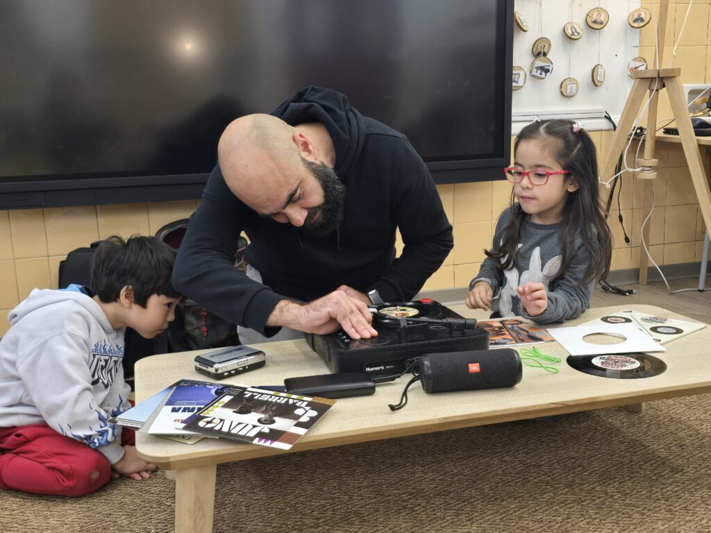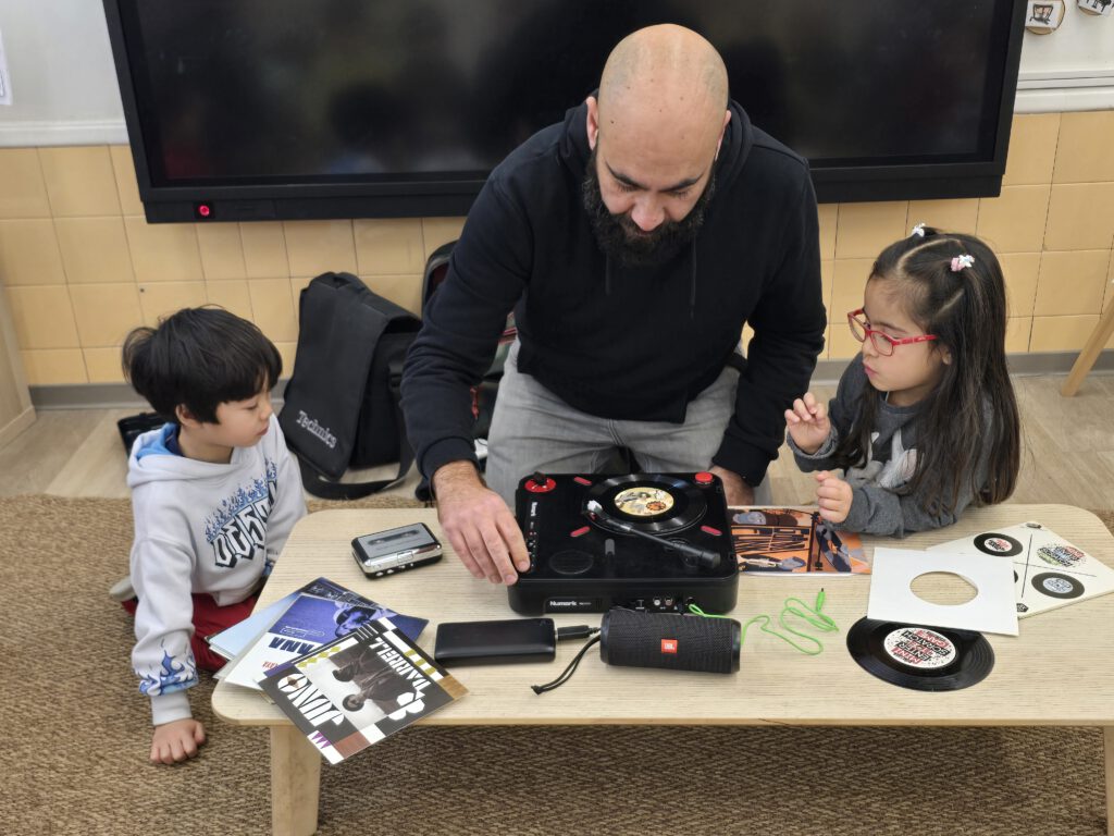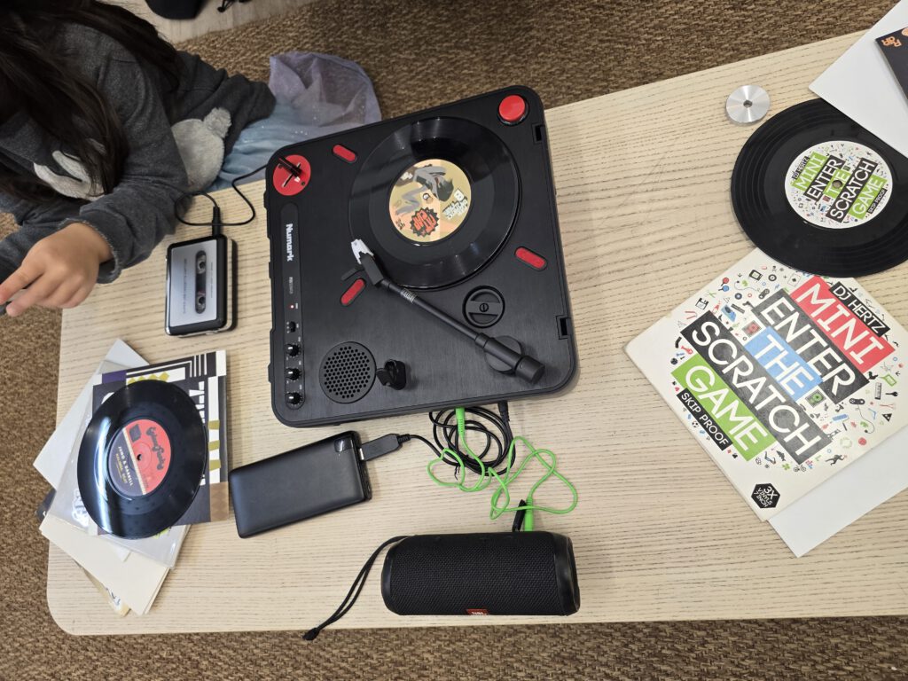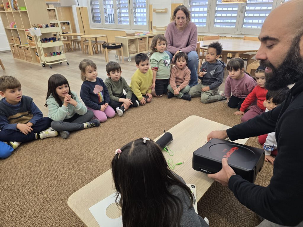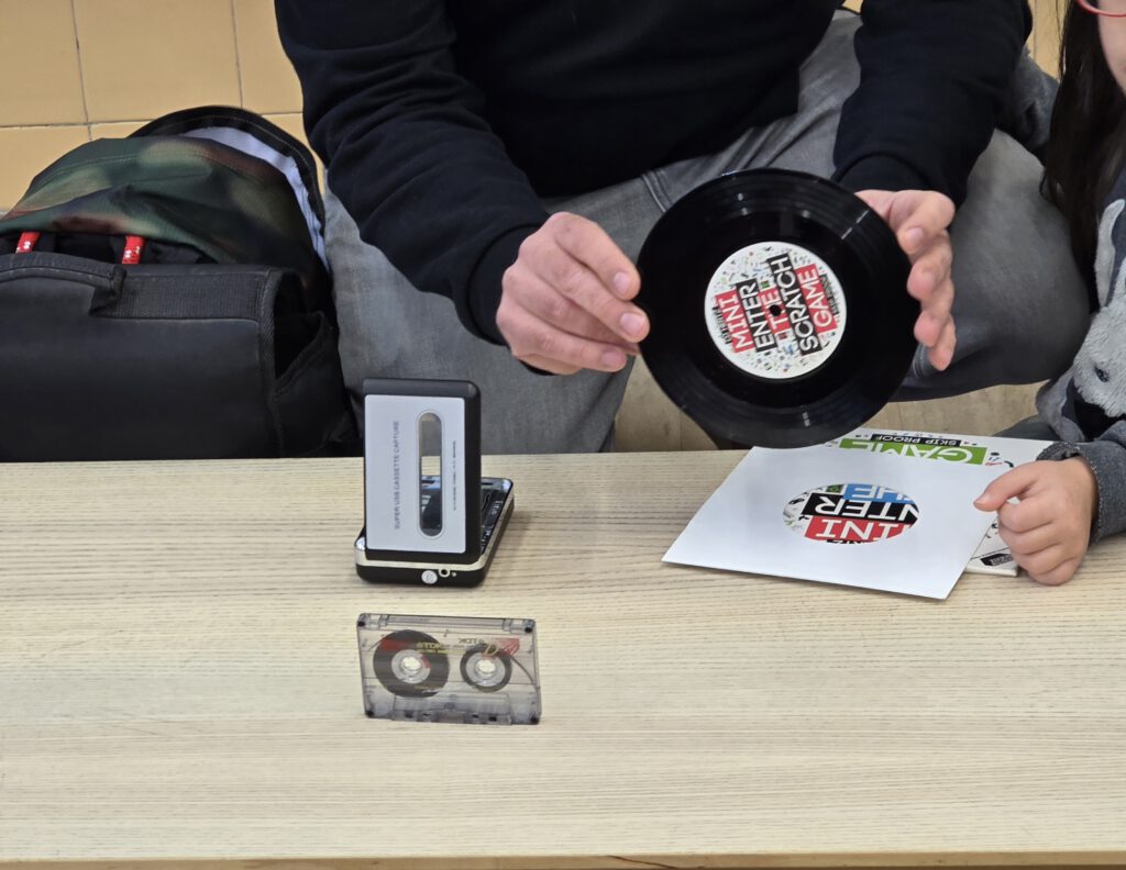 Al 1P, seguint amb el nostre projecte “el so”, avui hem tingut una sessió en la qual hem conegut un aparell que no coneixíem, el walkman, i les cintes que en ell s’hi poden reproduir, també hem vist en directe un plat (tocadisc), i els discs de vinil. Tot estris que ens permeten escoltar música. I el que més ens ha agradat, hem après a fer scratch amb el plat, quina experiència tan interessant! Moltes gràcies Sebas per la teva col·laboració!