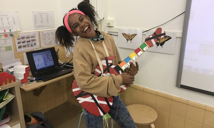 Què bé ens ho passem al laboratori de programació i robòtica! Hem fet parlar una guitarra feta de paper, cartró i paper d’alumini; hem jugat a ‘Guitar Hero’; hem programat els nostres instruments per tocar música… i tot gràcies al llenguatge de programació Scratch, a la placa electrònica Makey Makey i a la nostra creativitat.