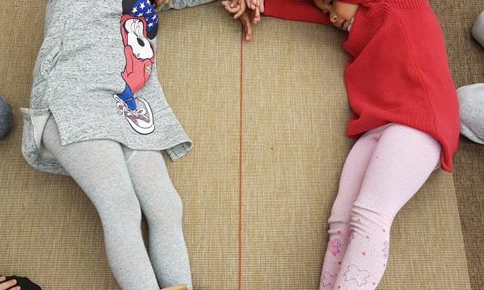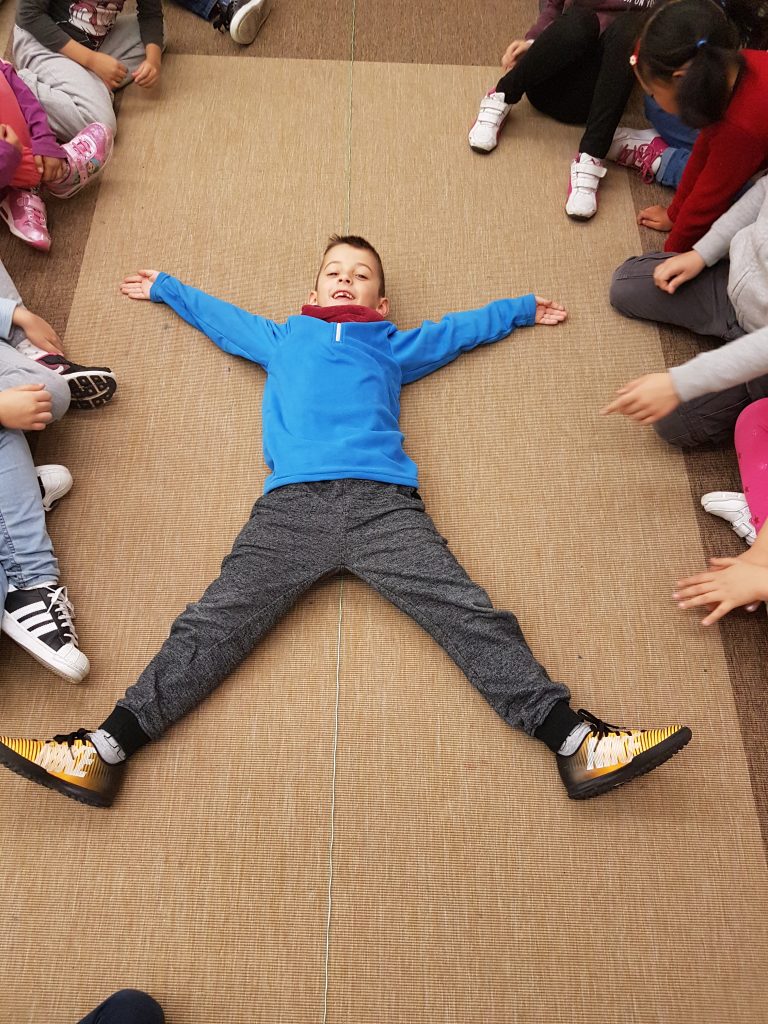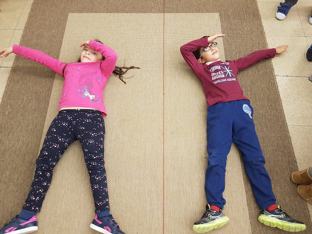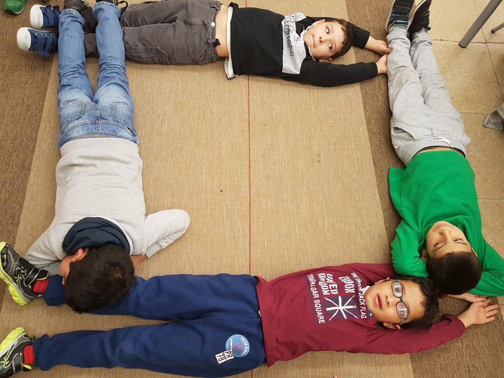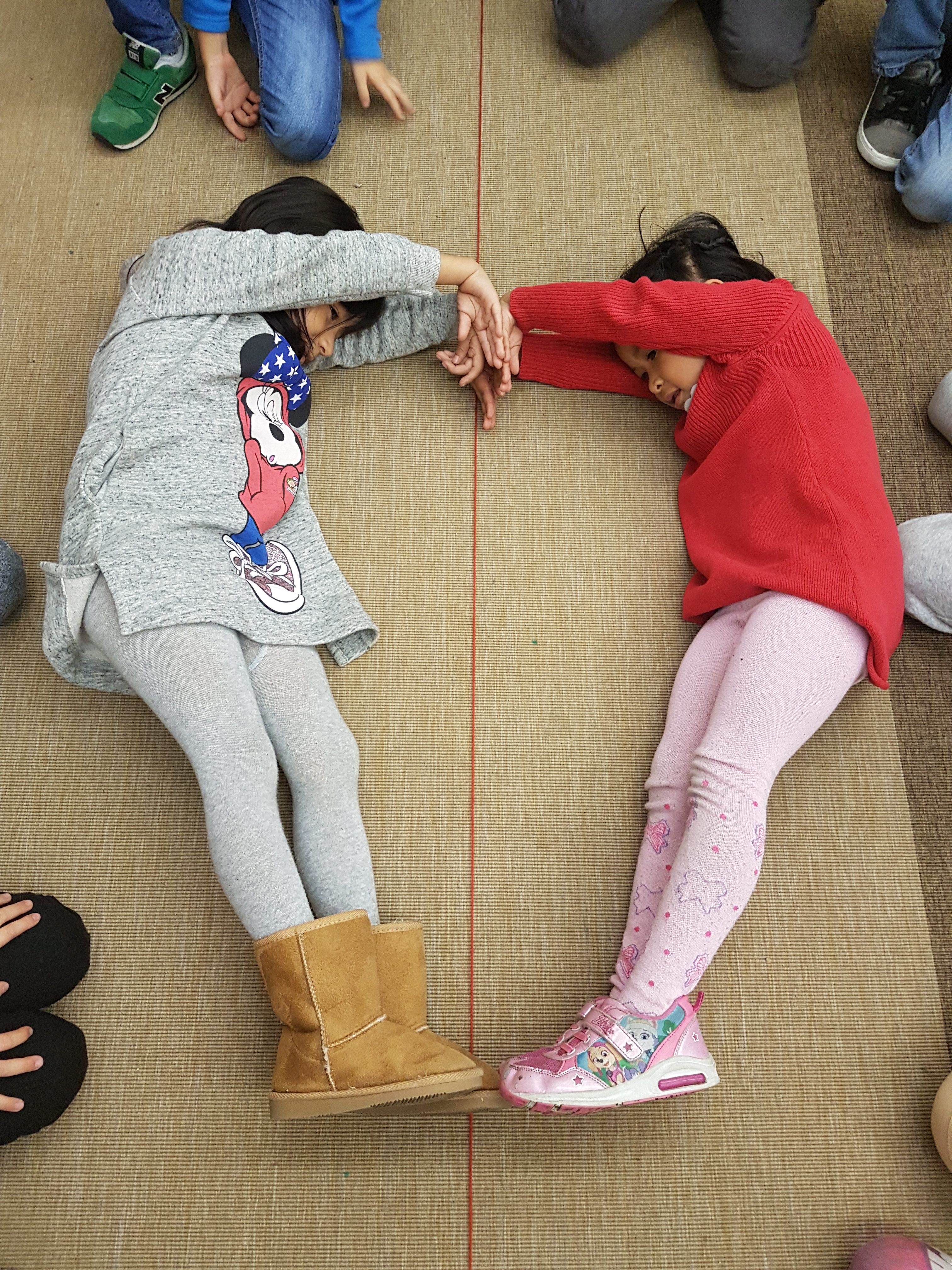 1st and 2nd graders represent shapes and symmetry with their bodies