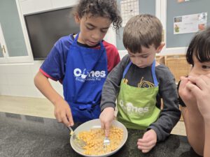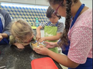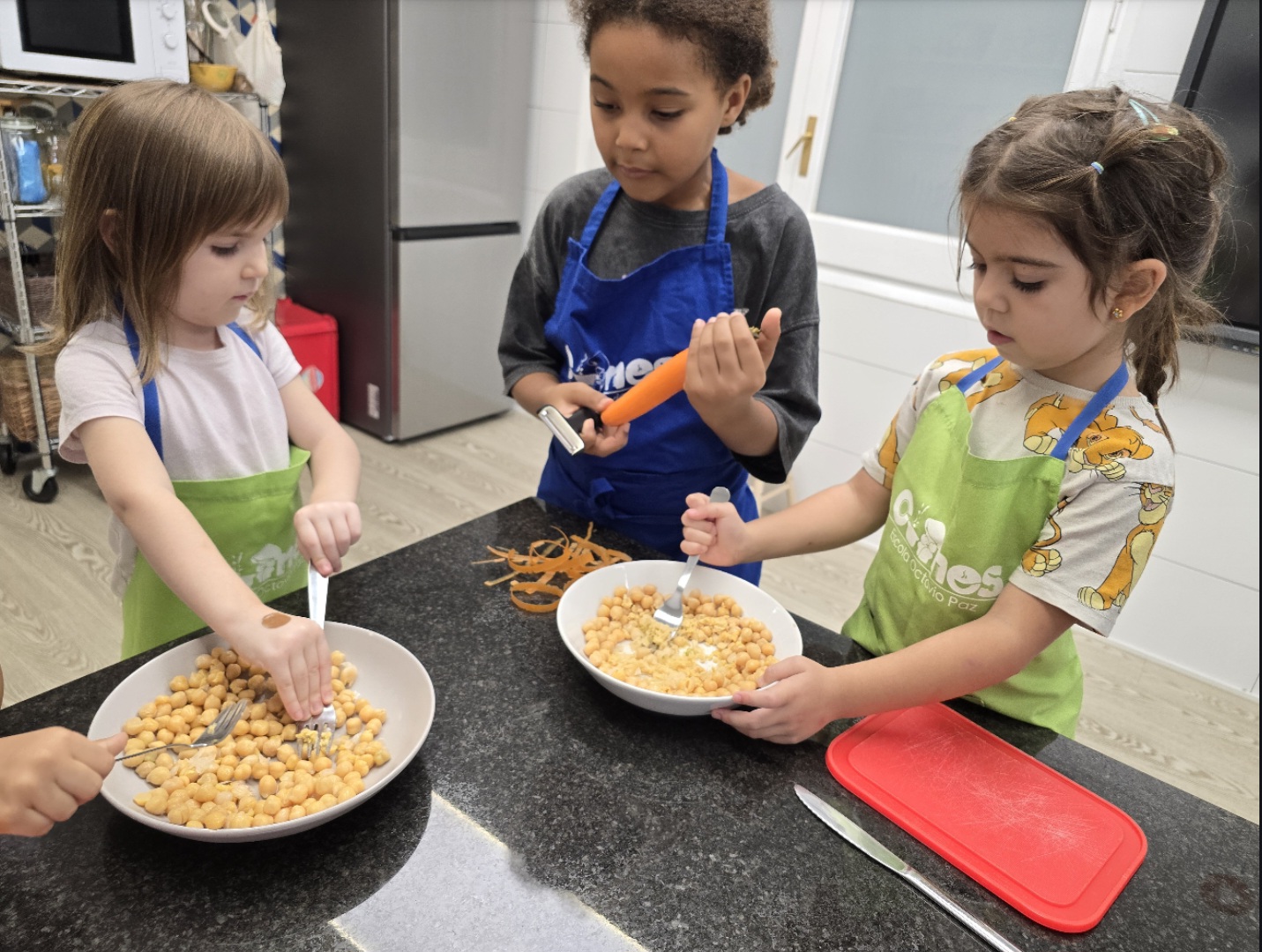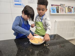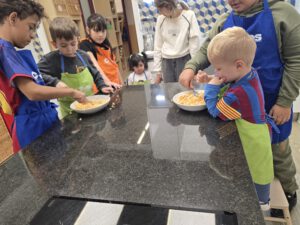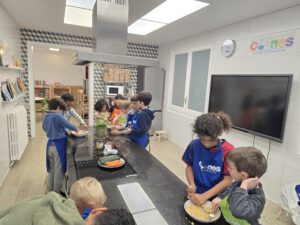 Un dels laboratoris que realitzem a tota l’escola és el laboratori de cuina. Algunes sessions les realitzem de manera conjunta la comunitat de grans i la comunitat de petits. És un d’aquells moments en què es genera màgia entre els infants i un aprenentatge profund.