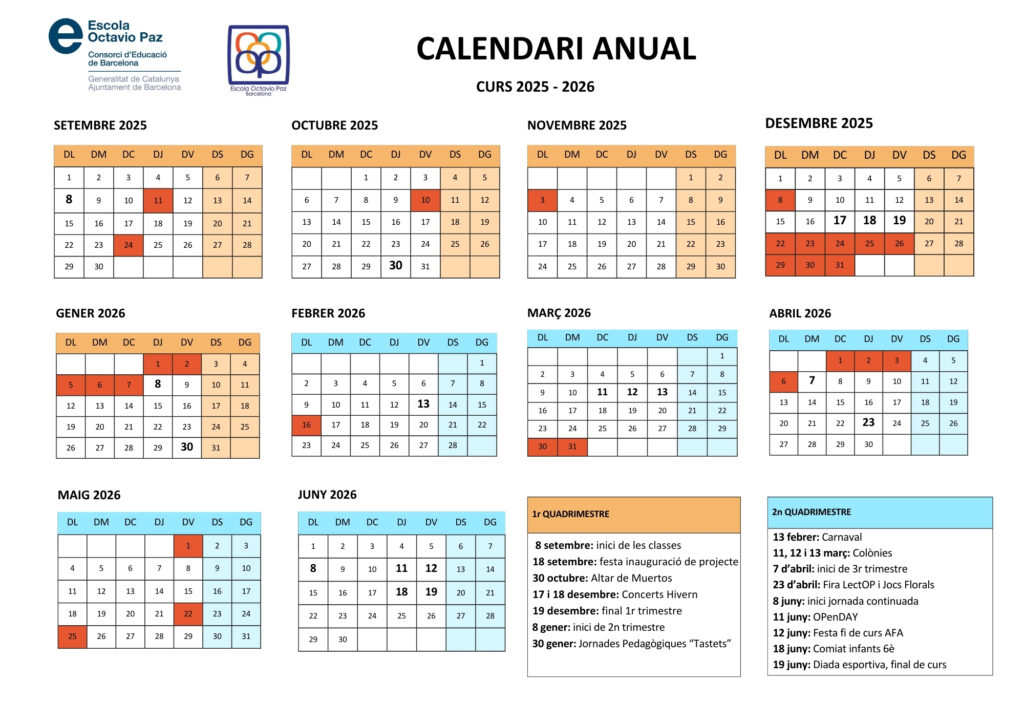 - Vacances de primavera: del 28 al 6 d’abril de 2026