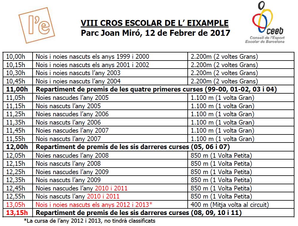 Es farà al Parc Joan Miró al Carrer d’Aragó, 2, 08015 Barcelona, i els horaris variaran segons els anys de naixement dels participants. Els teniu aquí sota detallats per anys i cursos: