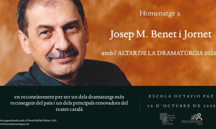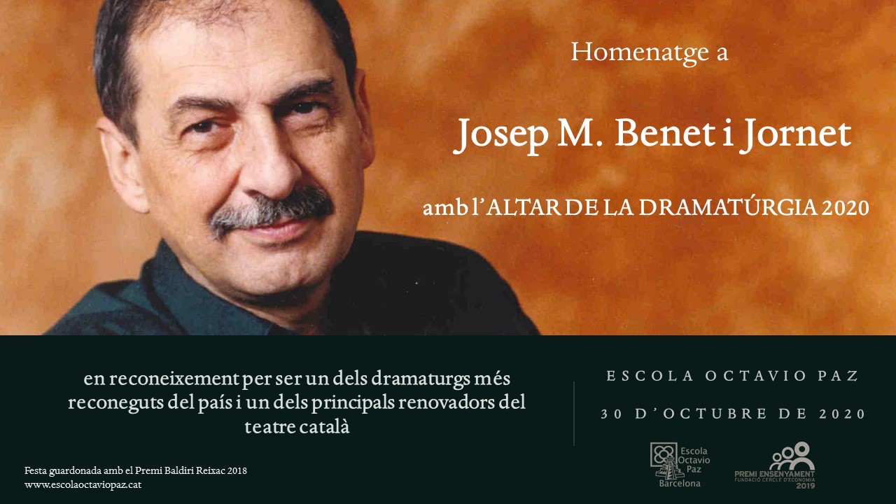 En el marc del Projecte Catalunya-Mèxic, enguany la comunitat educativa dedicarem l’Altar de la Dramatúrgia 2020 a J.M. Benet i Jornet, en reconeixement per ser un dels dramaturgs més reconeguts del país i un dels principals renovadors del teatre català.