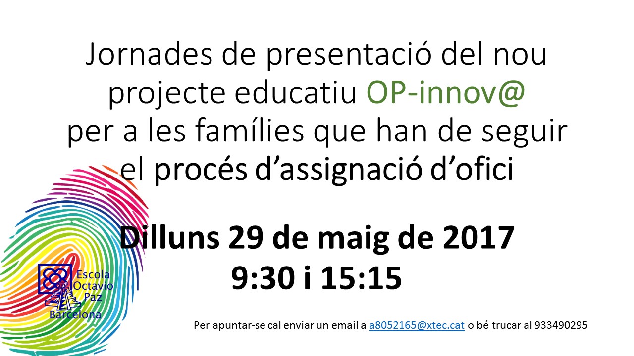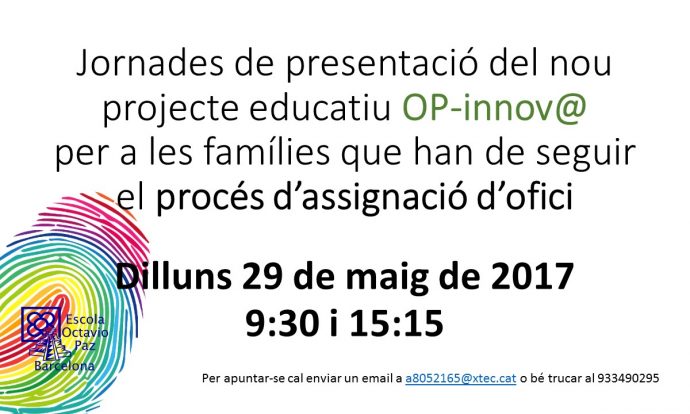 el proper dilluns 29 de maig a les 9:30 i a les 15:15 presentarem el nou projecte educatiu OP-innov@ per a les famílies que han de seguir el procés d’assignació d’ofici.