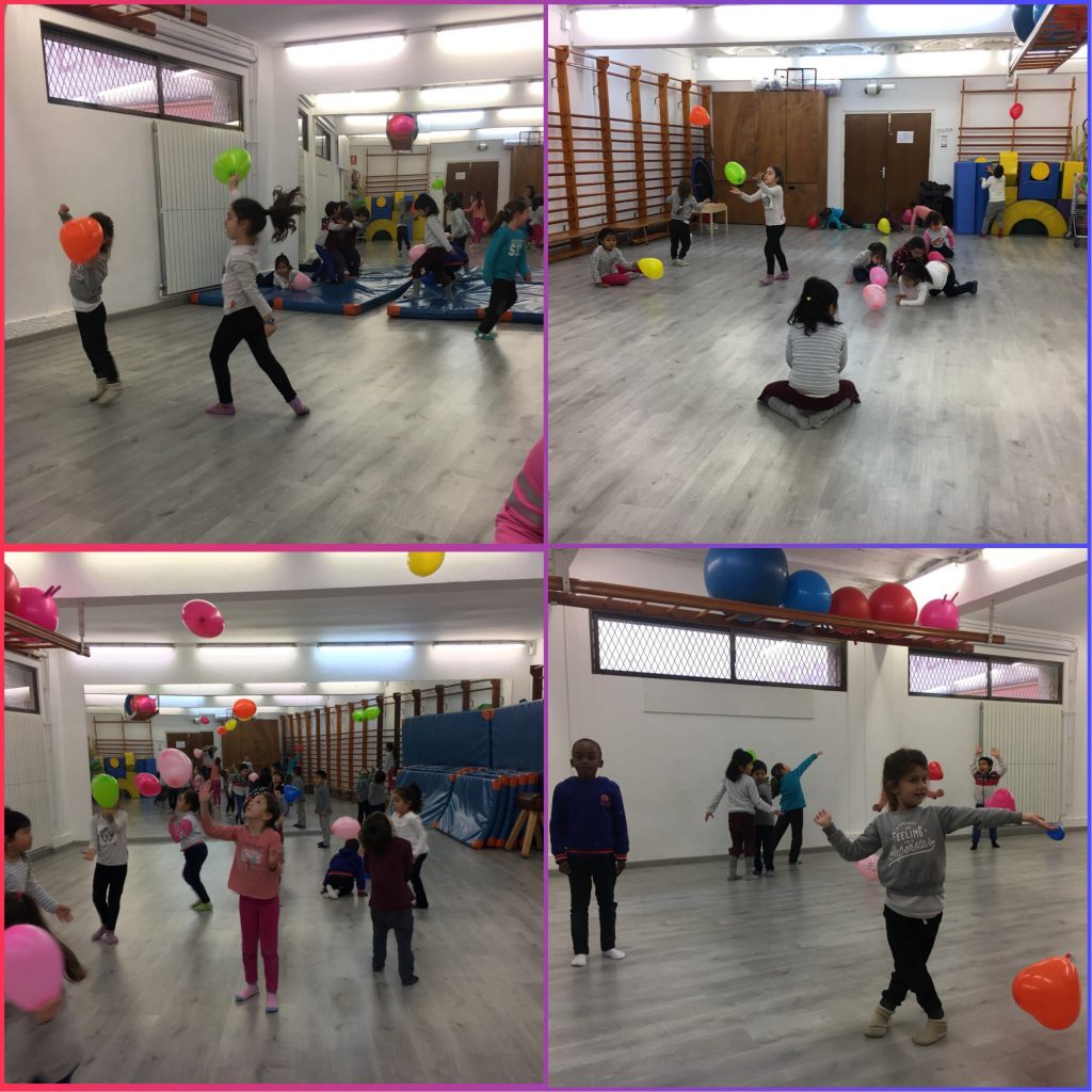 Primer de tot hem picat amb el nostre globus les diferents parts del cos que la Laura ens anava dient. Després havíem de conduir el globus amb les mans, el cap o els peus sense que toqués a terra. I per últim, només podìem bufar per moure els globus.