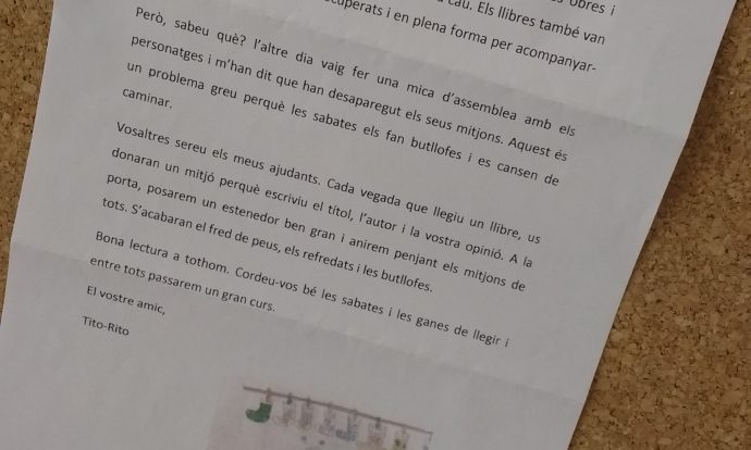 Les missatgeres de 6è ens han fet arribar a totes les classes de l’escola una carta misteriosa. Sabeu qui l’ha escrit? En Tito-rito! Hem d’ajudar-lo a buscar els mitjons del seus amics!