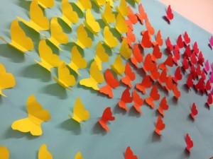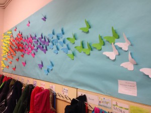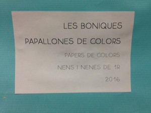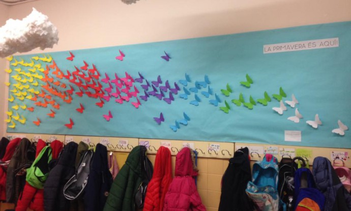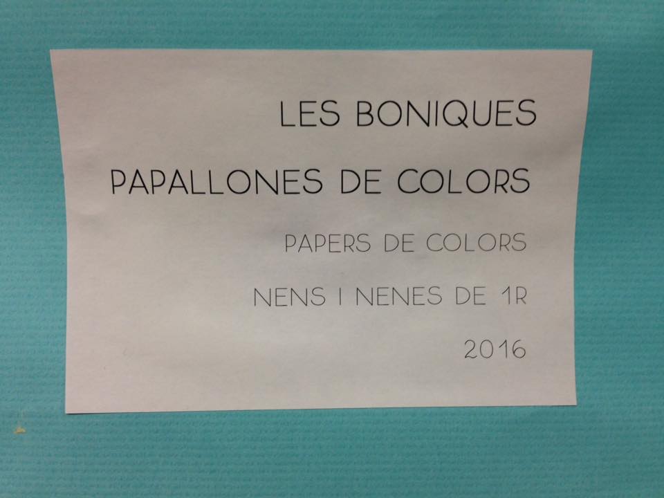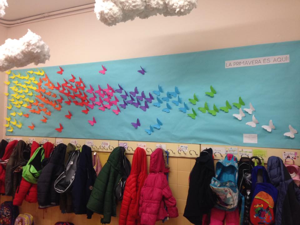 LES BONIQUES PAPALLONES DE COLORS. Aquest és el títol que li hem posat al mural de la primavera que hem fet els nens i nenes de 1r. Es tracta de milers de papallones de colors volant cap a la nostra classe.