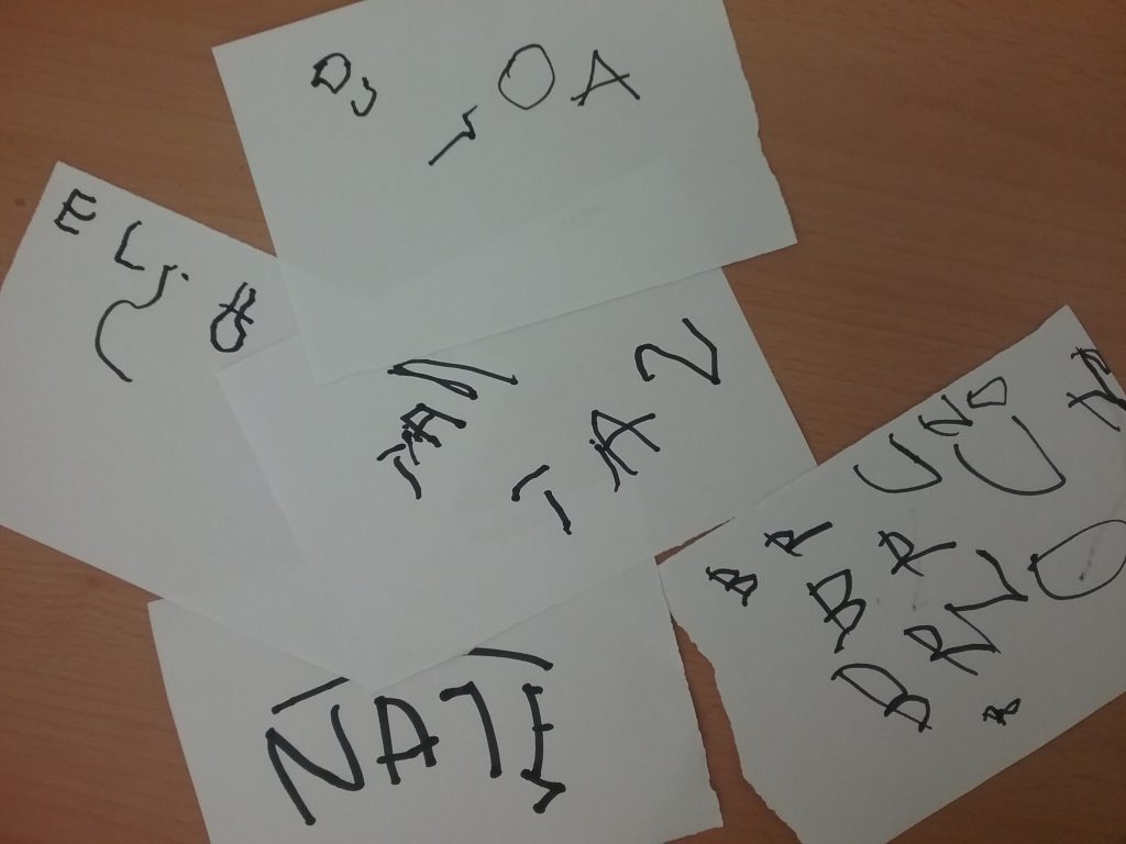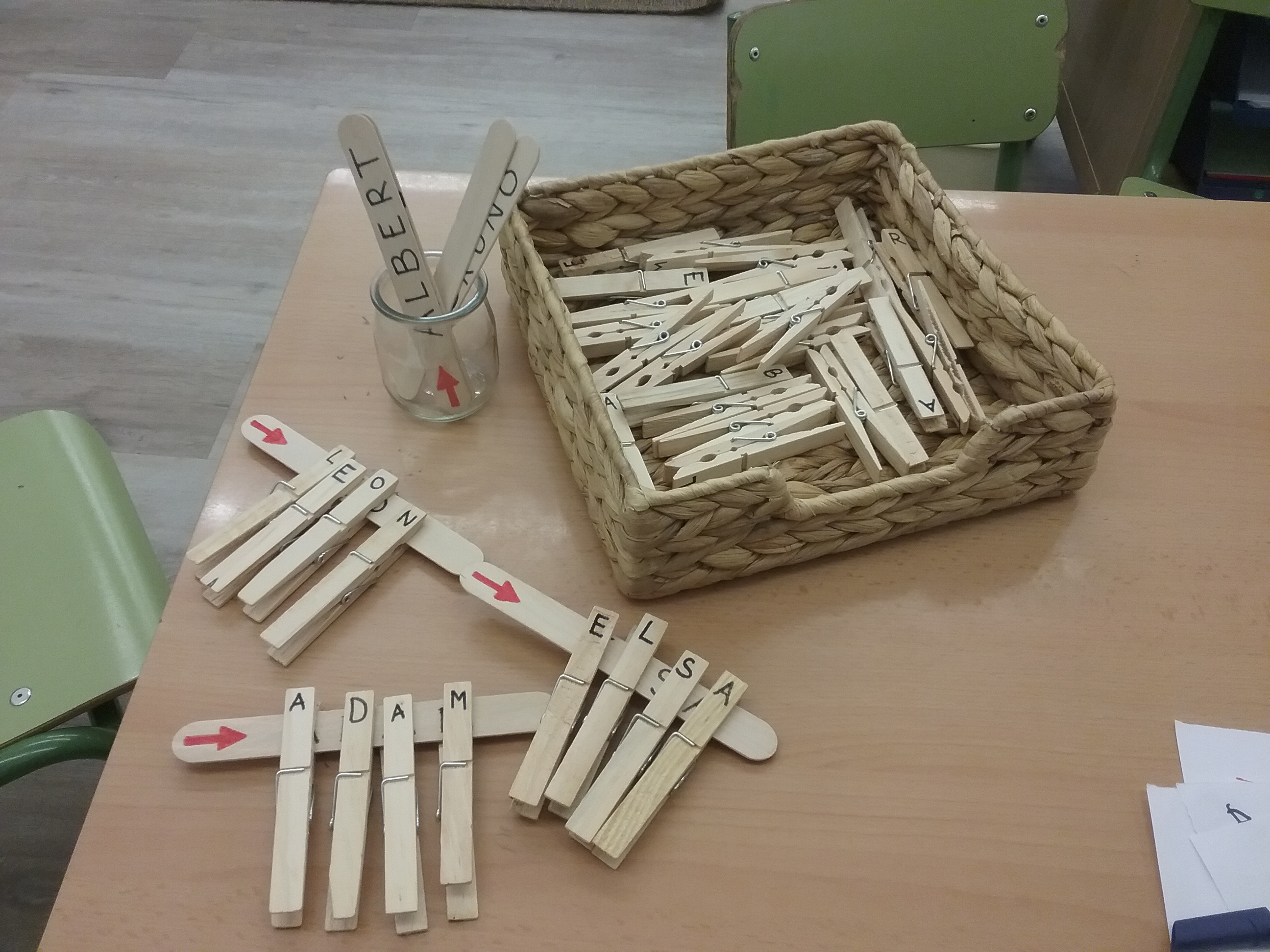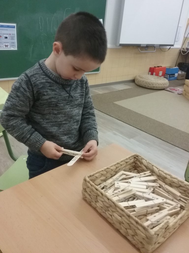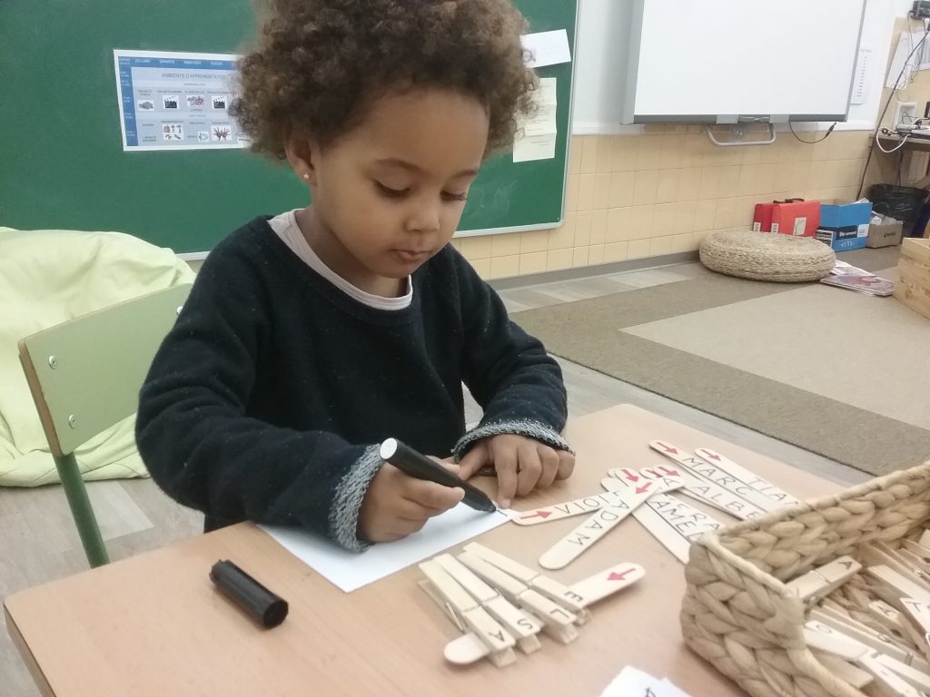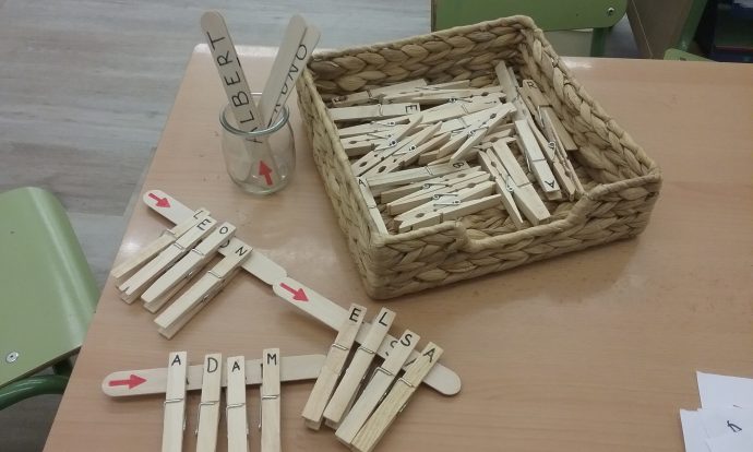 Poc a poc els infants més petits de l’escola, mitjançant una proposta amb agulles d’estendre, observem les lletres que conté el nostre nom, les busquem, les relacionem i finalment aconseguim fer el nostre nom sencer i fins i tot ens animem a escriure’l!