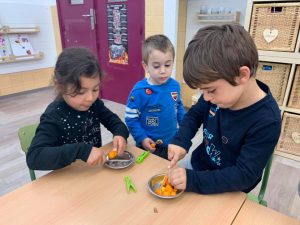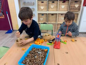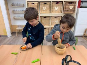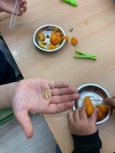 Morters, glans, balances, lupes, taronges… Així hem començat aquest matí a l’ambient experimentem! Després de treure-li tot el suc a les taronges, hem descobert que hi ha uns petits pinyols a dins, els podem plantar?