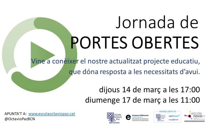 Et convidem a conèixer el nostre projecte d’escola a la Jornada de Portes Obertes que farem el dijous 14 de març a les 17:00 i diumenge 17 de març a les 11:00.
