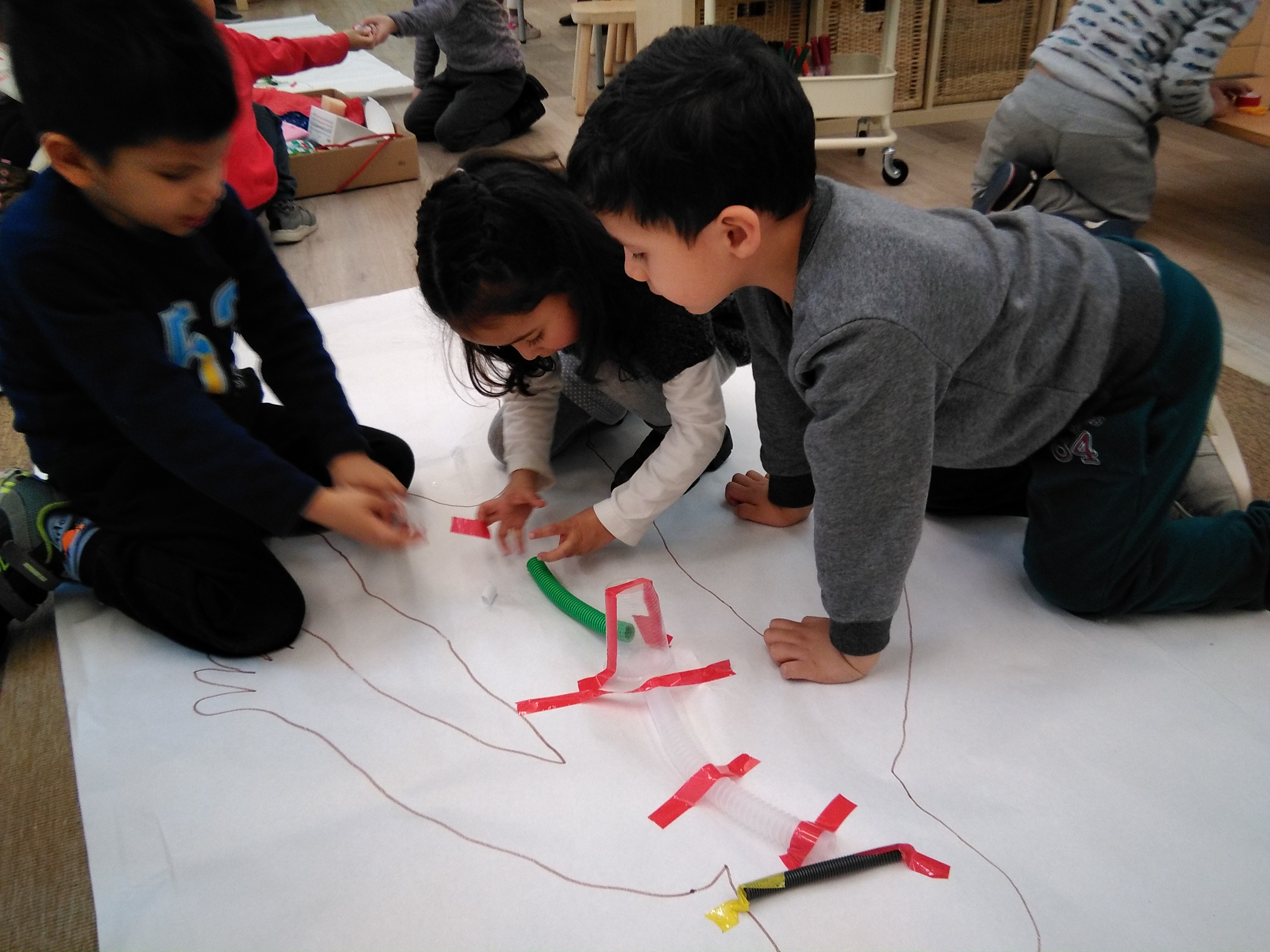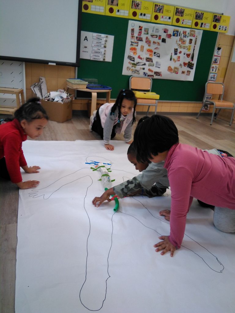 Per fer explícits els models intuïtius dels nens i nenes vam dibuixar el camí que fan les fulles d’heura pel cos de l’insecte pal. Fent el paral·lelisme amb el nostre cos també estem treballant per veure el recorregut dels macarrons en el nostre propi cos. Mireu quines maquetes!