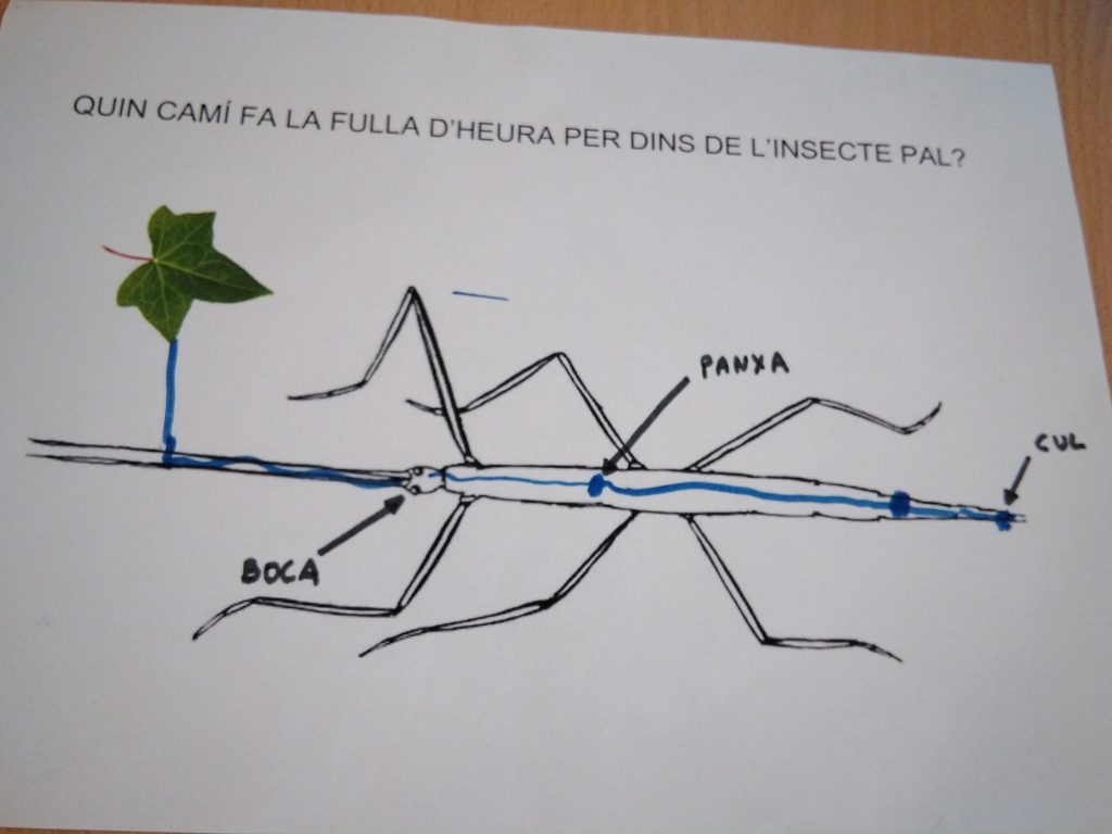 Durant l’observació dels insectes bastó, ens va sorgir el dubte d’on anaven les fulles d’heura que es menjaven els insectes. Les idees van ser diverses (a la panxa, als músculs, etc.) i un infant va verbalitzar “es converteixen en caca!”. Després de pensar-hi una estona, van arribar a la conclusió que l’aigua es converteix en pipi.