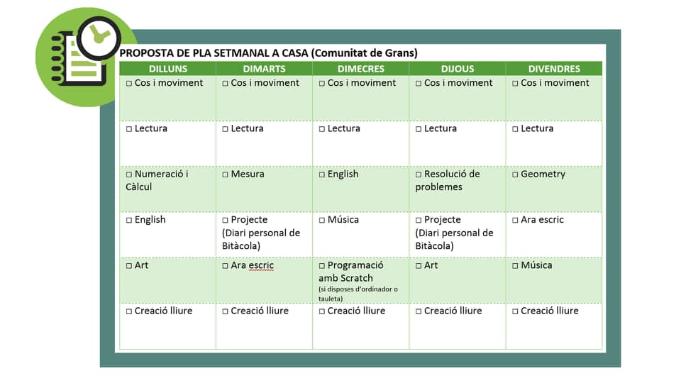 Amb l’objectiu de contribuir a l’organització i gestió del temps a casa, seguim acompanyant els infants de la comunitat de grans amb un recull de recursos setmanals i una proposta d’horari que cada família adaptarà a la seva situació i context.
