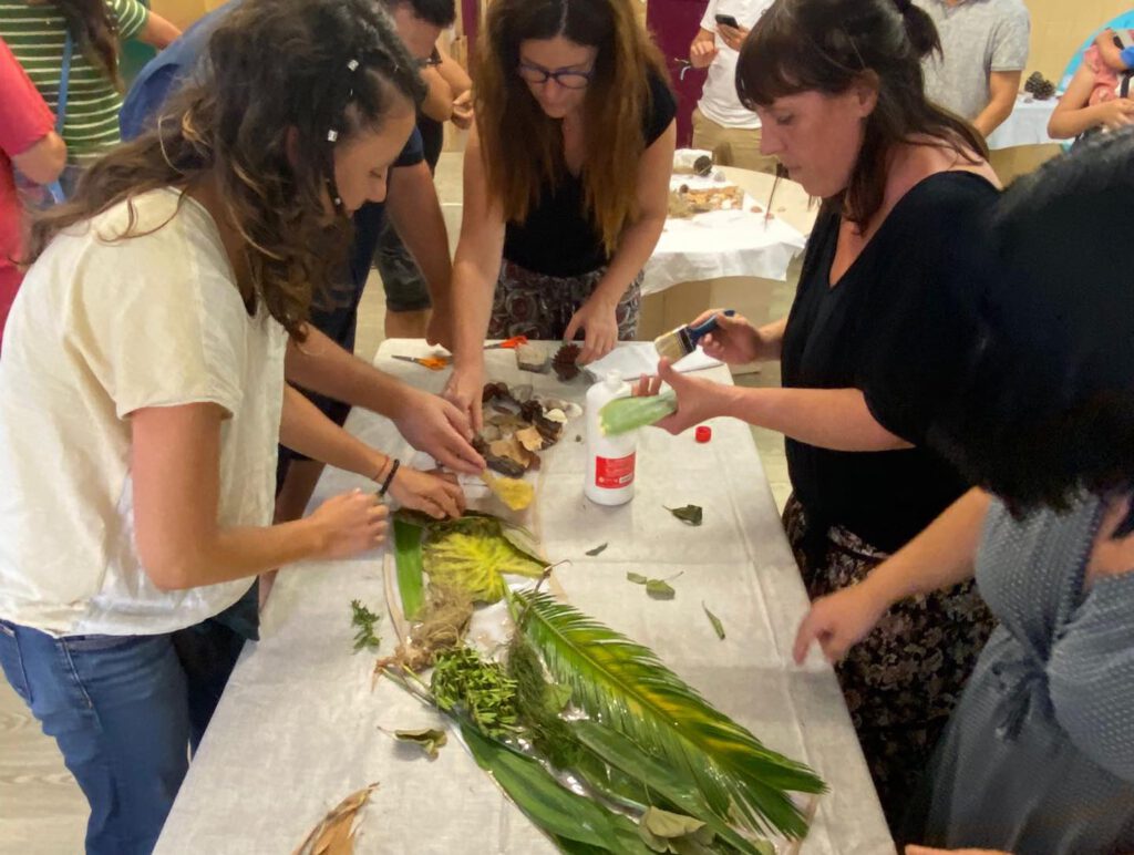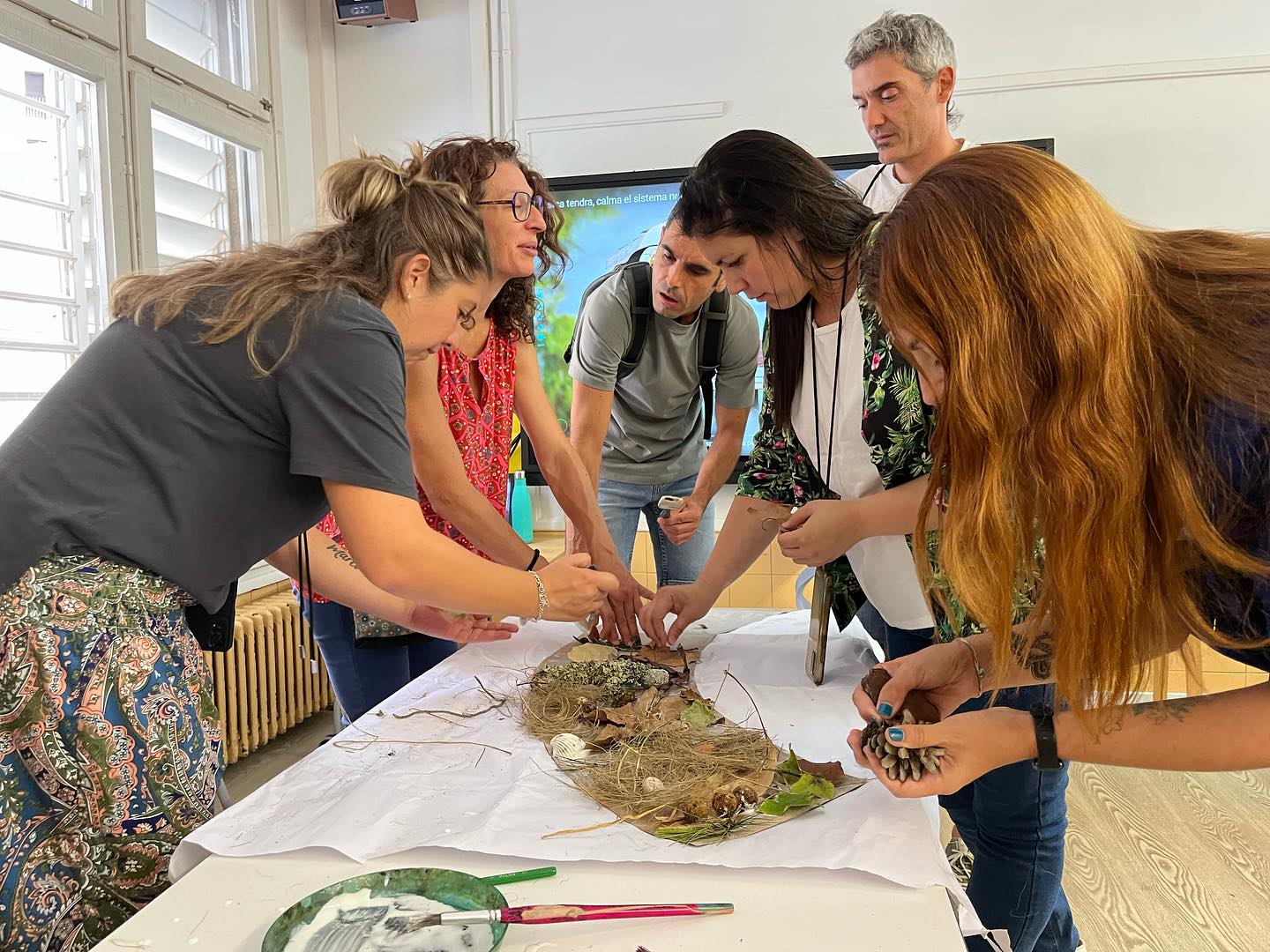 Avui ens hem retrobat amb les famílies de la comunitat de mitjans i amb pinyes, branques i fulles seguim confegint la instal·lació d’espais naturals.