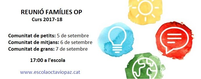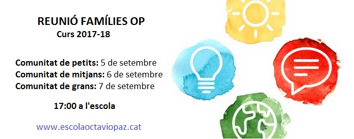 L’equip de mestres i el personal de serveis volem continuar consolidant la implementació del Projecte educatiu OP-innov@ amb el desplegament d’una nova fase que us presentarem a la REUNIO DE FAMILIES els següents dies: