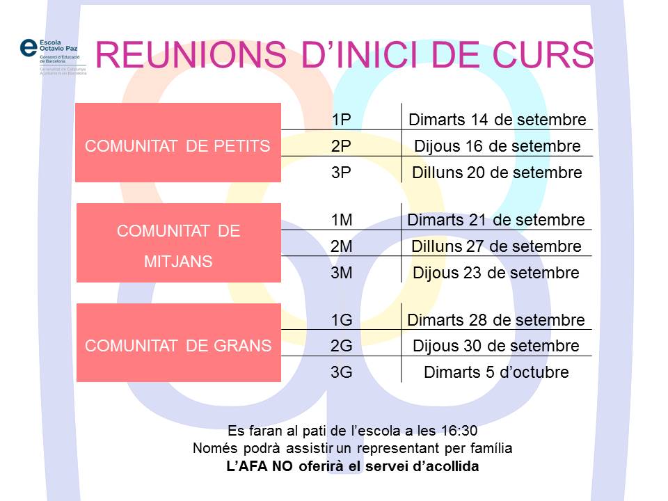 Totes les reunions es faran al pati de l’escola a les 16:30