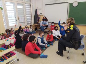 Avui els grups 1M i 2M acompanyats de la Brigitte, agent de la Guàrdia Urbana, hem après a travessar pel pas de vianants amb cura i correctament. A més hem aprofitat per fer algunes preguntes i aprendre nou vocabulari dels elements del carrer!
