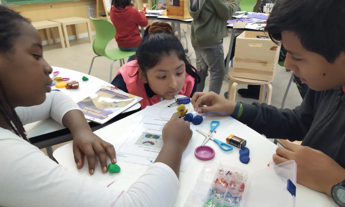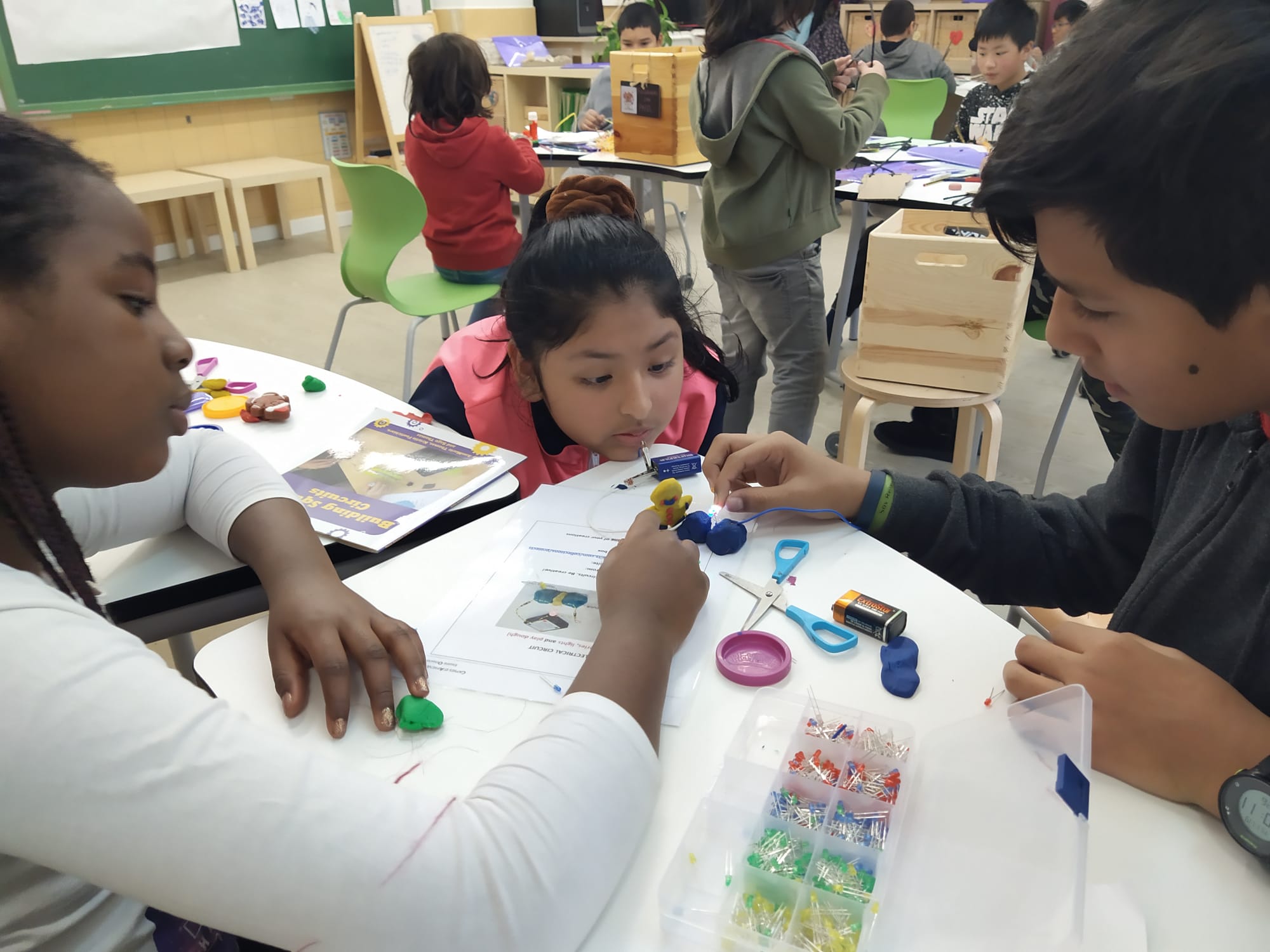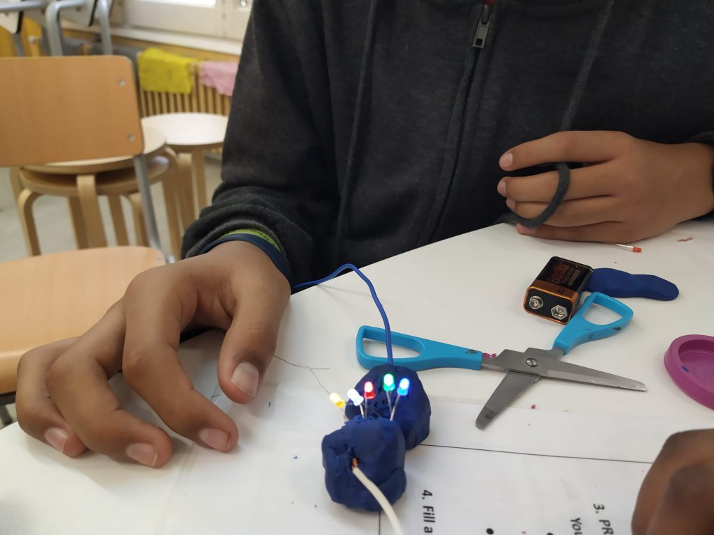 Mitjançant capses d’aprenentatge, alumnes de 5è i 6è descobrim el funcionament d’un circuit elèctric. Connectem els diferents elements, estudiem la conductivitat de diversos materials i, finalment, inventem maneres originals d’aplicar allò après. Treballem amb el cap i amb les mans. Fem servir el raonament i la creativitat a parts iguals.