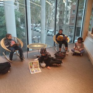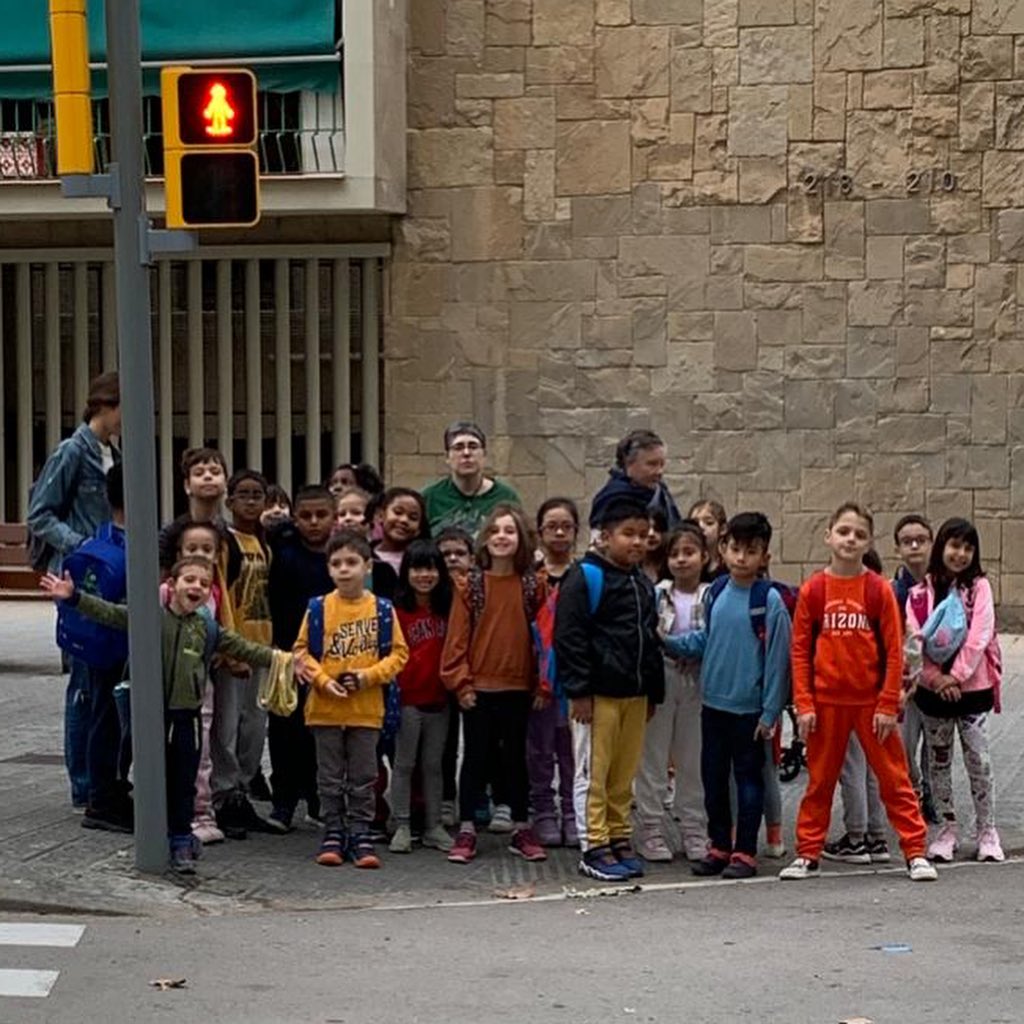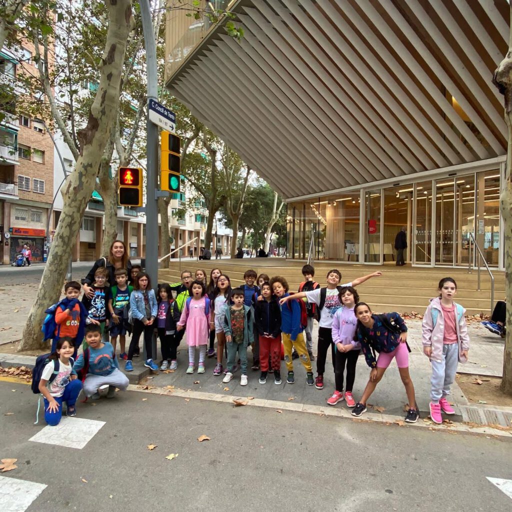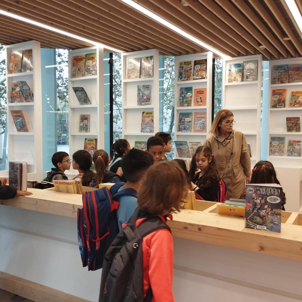 Matí descrobrint el mural, el semàfor i el racó a la biblioteca Gael García Márquez, en homenatge a Francisco Ibáñez.